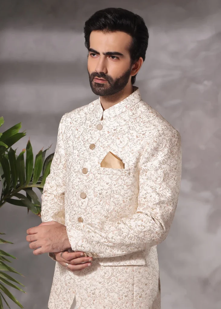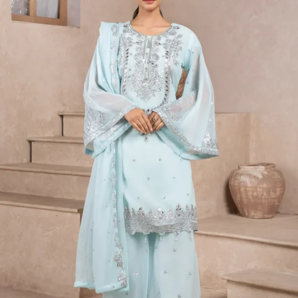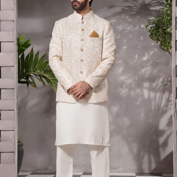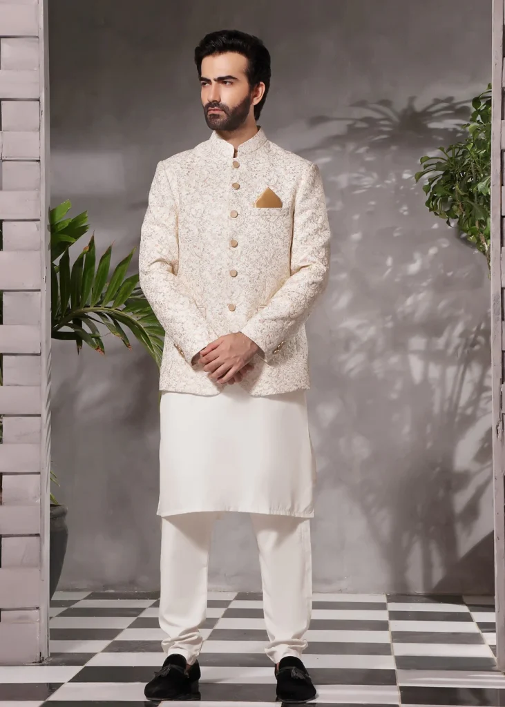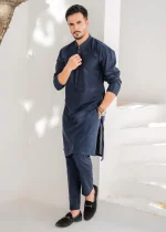 A modern signature embroidered kurta with Mandarin collar; paired with straight trousers. This is a 2-piece stitched outfit.
